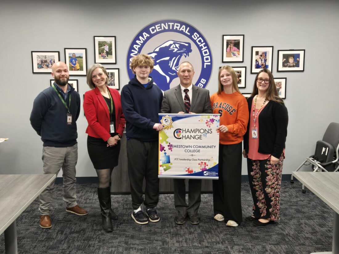 The New York State School Boards Association has recognized the Panama Central School District and Jamestown Community College through its Champions of Change program for a partnership that expands leadership and college-credit opportunities for high school students. A banner presentation ceremony was held at Panama Central School district offices on Jan.7, with Kurt Gustafson, NYSSSBA ambassador, on hand to offer congratulations to representatives from JCC and Panama, including students, teachers, and administrators. Through JCC’s College Connections program, Panama High School offers Leadership Engagement, Leadership Development, and Public Speaking courses to students. Those who successfully complete all three courses are eligible to earn a Leadership and Personal Effectiveness microcredential through JCC. Students enrolled in the leadership courses, taught by Panama teacher Helen Keefe, have coordinated several community events and service projects in recent years, including a community Thanksgiving dinner and an Easter egg hunt. College Connections is a partnership between JCC and local school districts that gives high school students the chance to take college-level classes while still in high school. The program helps students build academic and leadership skills while earning college credit close to home and at a lower cost.