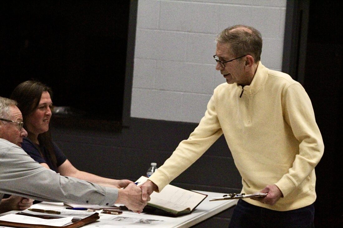 Dave Rowley shakes hands with Mayor Rudy Abersold after being sworn in as the newest Cassadaga Village Trustee. P-J photo by Braden Carmen