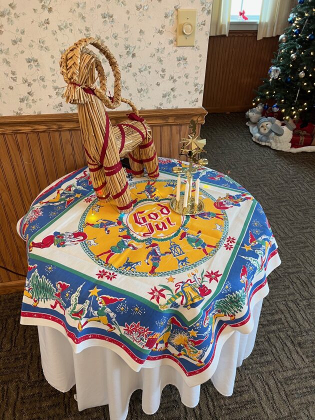 Shown are one of the Swedish decorations at the recent Christmas dinner. The message on the table cloth means Merry Christmas in the Swedish language.