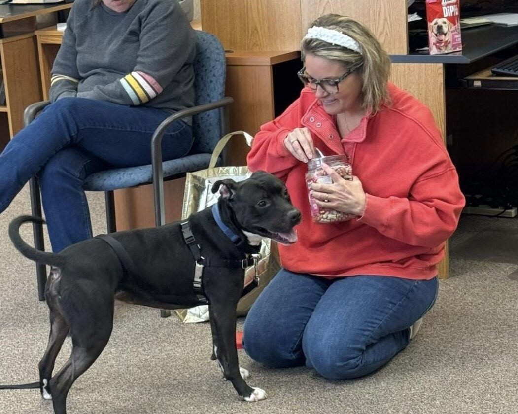 Carbon, a rescued dog, getting treats from Humane Society staff while on a visit to Chautauqua Patrons Insurance Company.