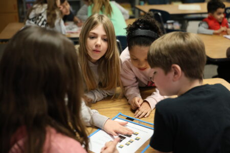 Ring Elementary School third graders excitedly discuss which story they liked better as part of a “March Madness” bracket activity that asks them to use their critical thinking skills to “advance” a book to the next round of the competition.