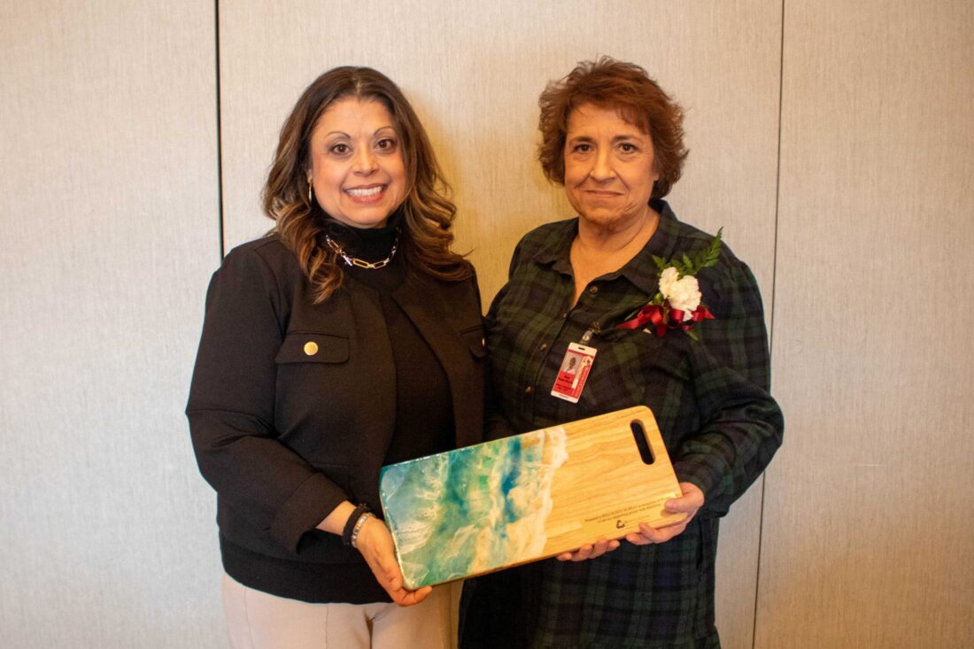 Resa Rosen-Murray receives an award for 45 years of service from Rhonda Howard, The Resource Center’s director of human resources. Rosen-Murray was given a cutting board decorated by people with disabilities at TRC’s KeyBank Art House at Edgewater on Jamestown.