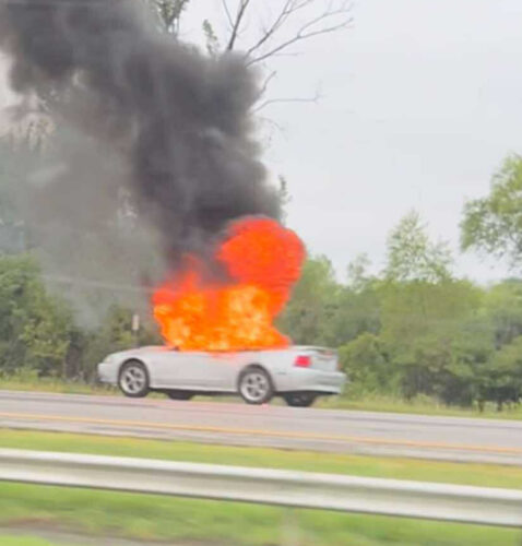 Multiple departments responded to a car fire on the New York State Thruway on the westbound lanes before the Dunkirk-Fredonia exit. Heavy smoke was showing from the vehicle around 1:30 p.m. The blaze was near New Road and mile marker 466.4.