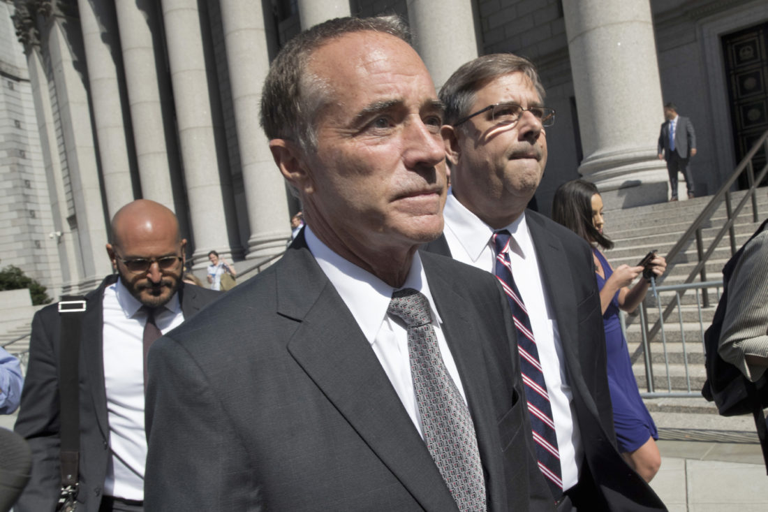 FILE - This Aug. 8, 2018 file photo shows Republican U.S. Rep. Christopher Collins as he leaves federal court in New York. In an about-face, Collins says he will suspend his re-election campaign after insider-trading indictment. (AP Photo/Mary Altaffer, File)