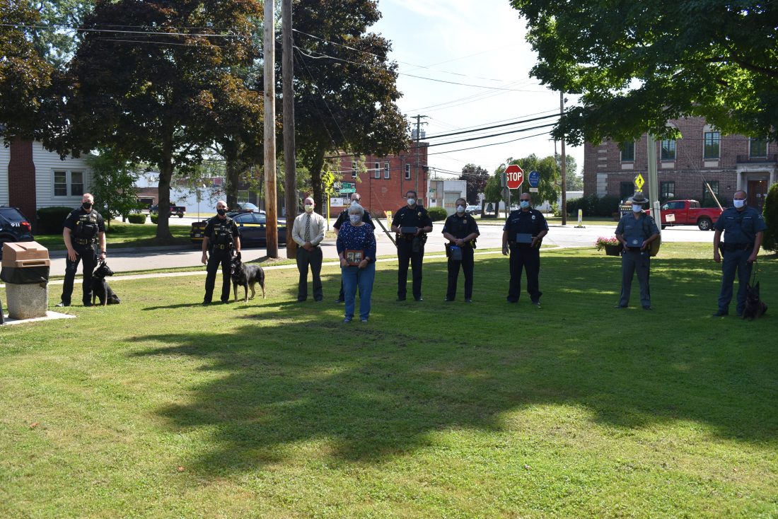Gretchen Beckstrom, center, stands with officers of the New York State Police, Chautauqua County Sheriff's Office, Ellicott Police Department and Lakewood-Busti Police Department after distributing handmade paracord collars to K-9 officers Drake, Bentley and Kara. P-J photo by Jay Young