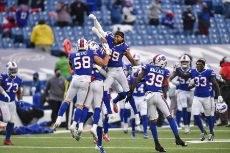 - Buffalo Bills’ Matt Milano (58) and Josh Norman (29) and teammates celebrate after an NFL wild-card playoff football game against the Indianapolis Colts Saturday, Jan. 9, 2021, in Orchard Park, N.Y. The Bills won the game 27-24. (AP Photo/Adrian Kraus)