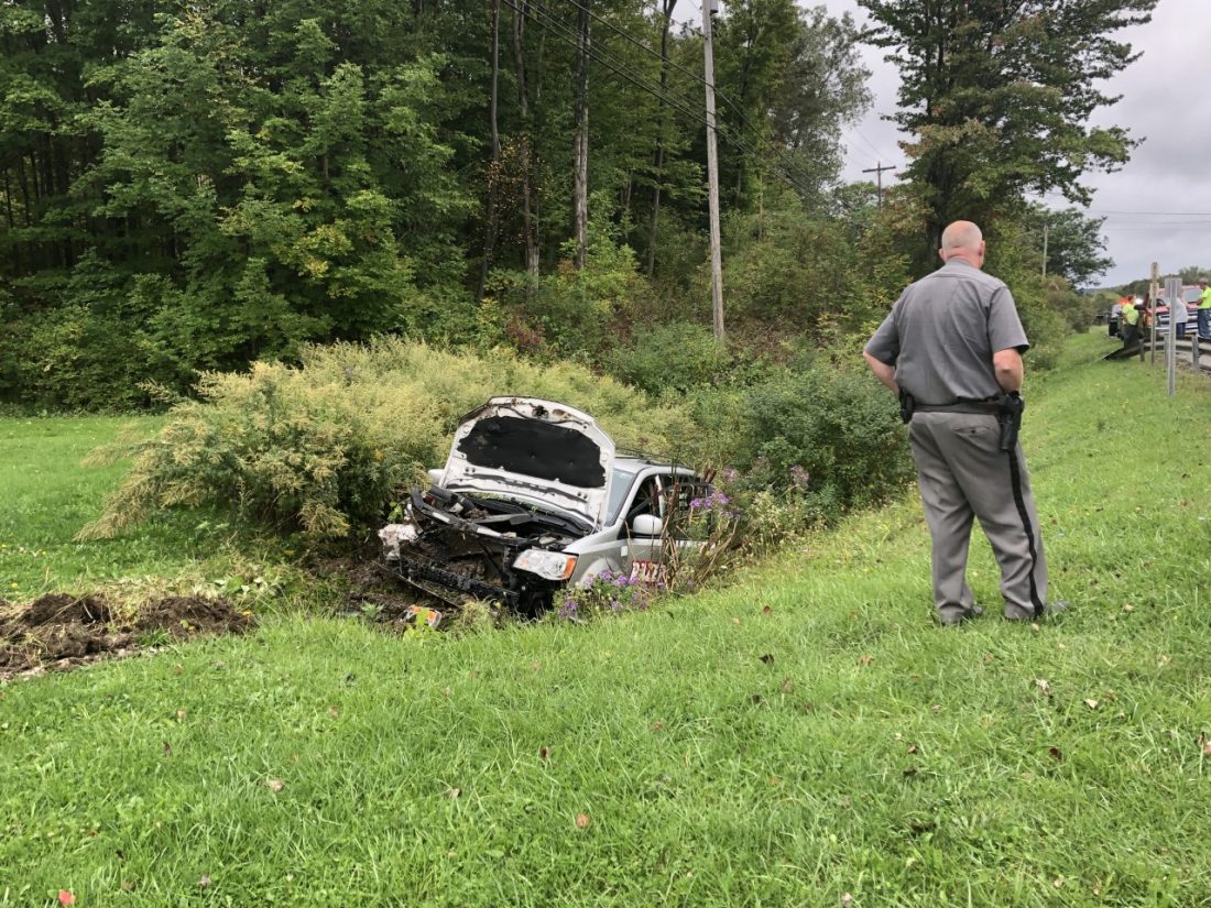 A trooper at the scene said an individual driving a mini van was traveling north when she went off the side of the road, landing in a ditch, heavily damaging her vehicle. She was placed in an ambulance and was believed to be headed to a local hospital. The woman was conscious and did not appear to have any life threatening injuries.