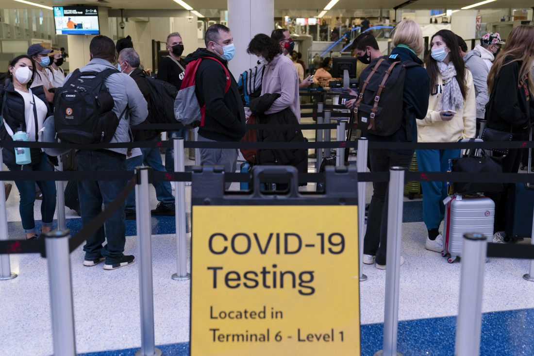FILE - Travelers wait in line for screening near a sign for a COVID-19 testing site at the Los Angeles International Airport in Los Angeles on Nov. 24, 2021. Beginning next week, travelers heading to the U.S. will be required to show evidence of a negative test for the virus within one day of boarding their flight. The previous period was three days. (AP Photo/Jae C. Hong, File)