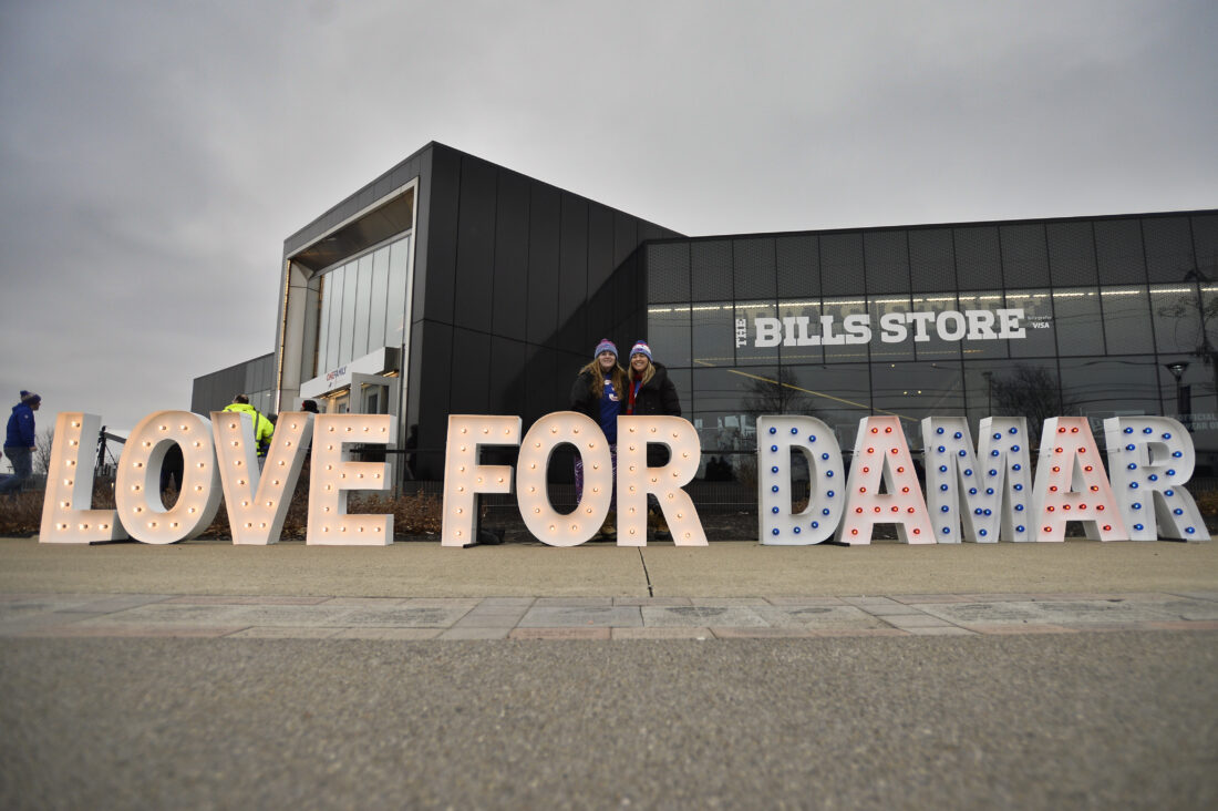 Fans stand for photographs by a sign in support of Buffalo Bills safety Damar Hamlin outside Highmark Stadium before an NFL football game against the New England Patriots, Sunday, Jan. 8, 2023, in Orchard Park, N.Y. Hamlin remains hospitalized after suffering a catastrophic on-field collapse in the team's previous game against the Cincinnati Bengals. (AP Photo/Adrian Kraus)
