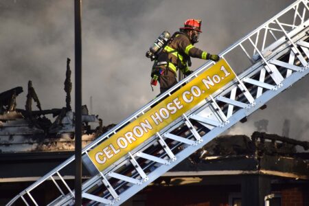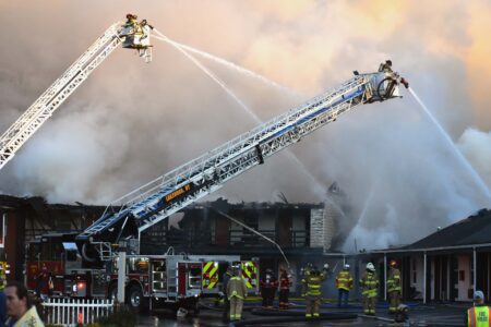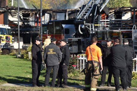 Firefighters are pictured Tuesday morning at the Colony Motel on Fairmount Avenue in West Ellicott.