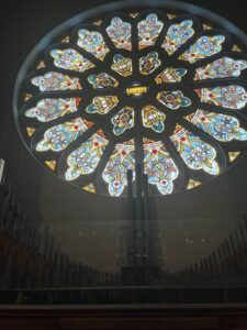 The stained glass Rose Window at Holy Apostles Parish Ss. Peter and Paul is pictured. Repairs on the historic stained glass window were completed earlier this year.
