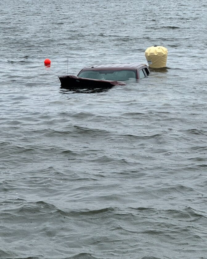 Daniel Scott Emerson’s truck is pictured floating to the surface of Chautauqua Lake on Friday. Photo courtesy Erie County Sheriff’s Office Facebook page