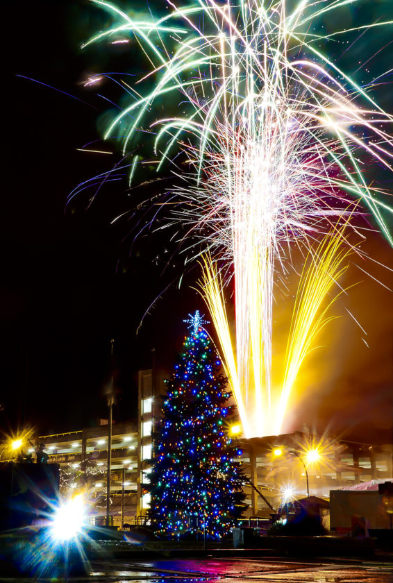 The fireworks at this year’s Christmas parade downtown are much different. These are shot at f/16 so more is in focus and ISO 100 because the light is so bright that the sensor doesn’t need to be so sensitive, but the shutter speed is set at six full seconds so the light trails are recorded as the pieces of shimmering light are flying through the air. When I shoot fireworks, I often put the shutter speed on BULB mode so I can use a remote to hold the shutter open as long as I need to get a beautiful display of light.