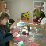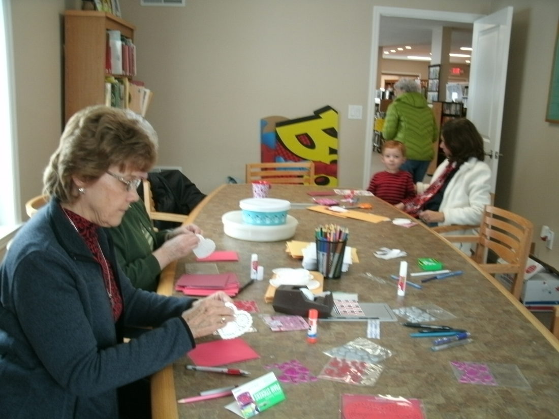 Sheila Hoene and others begin working on valentine cards for veterans at the Kennedy Free Library.