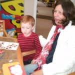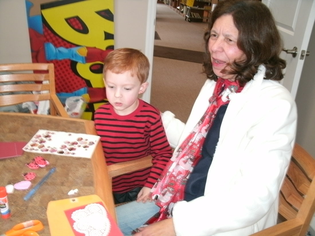 - Kade Joseph Babcock and Diane Babcock working on valentine cards for veterans at the library.