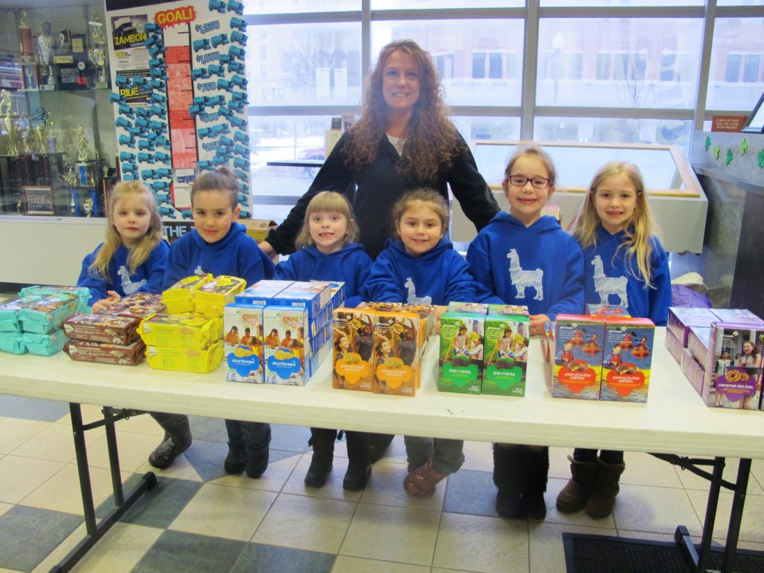 Girl Scout Troops 200080 and 200262 set up shop at Northwest Arena on Saturday to sell their famous cookies to those visiting for a hockey tournament. Tabatha Smith, troop co-leader, said the girls enjoyed it very much. The troops will also be at the Chautauqua Mall on Friday from 5-9 p.m. “We love it,” Smith said. “We did it last year.” Pictured, from left, are Sienna, Lauren, Madalynn, Lily, Zoie and Elizabeth. Smith is pictured behind them.