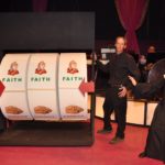 Joann Feher Liffner added her spin on the spacey and incoherent Sister Mary Paul aka Sister Amnesia who has lost her memory when a crucifix fell on her head. Sister Amnesia hosts a game of “Holly Rollers,” using a giant slot machine depicting the virtues: Faith, Hope, Charity, Will and Grace. Sister Mary Annette was her puppet nun who lacked verbal discretion. Amnesia appeared on stage to sing hiding the puppet within her habit. Her surprise was priceless when she pulled out her hand and the puppet was missing. Liffner stepped away from her classical voice to sing a country ballad and also belt out a few other show tunes.