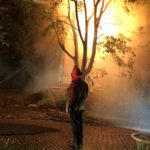 Crews were forced to spray water from odd angles in an attempt to douse the vacant structure, also covered by trees on multiple sides.