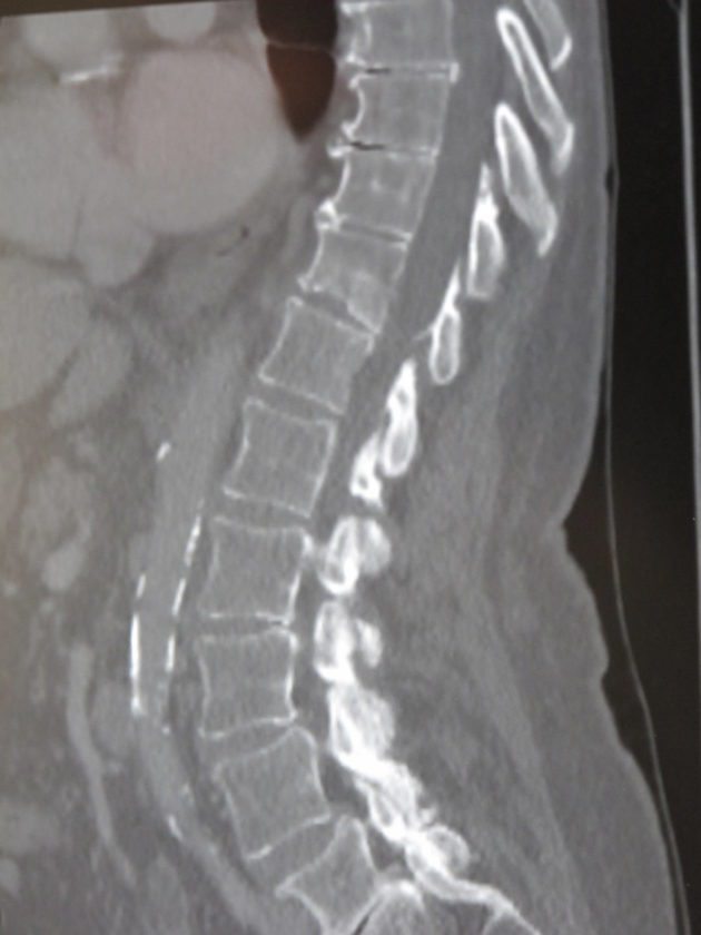 A MRI image of vertebral compression fractures, which were fixed through a vertebroplasty procedure in which bone cement is injected through a small hole into the problem area to relieve back pain. P-J photo by Dennis Phillips