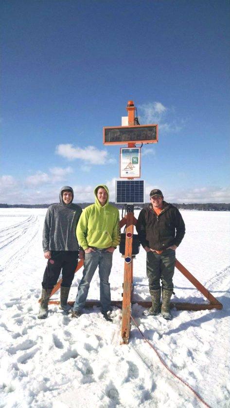Chautauqua Lake Association volunteers pose with the ice pick tripod on Chautauqua Lake after putting it into position for its annual contest. The pick is located on the ice in front of the Lawson Center in Bemus Bay. Submitted photo