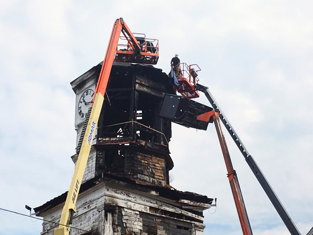 “The cross was saved from the top, it’s currently in one of our board member’s barns at the moment for safe keeping. We’re not sure if it’ll be going back up on top yet but we’ll memorialize it some way,” he said. “Our goal with the whole process has just been to restore the structure, and to harness the history of it. The steeple was 132 years old but the square base was part of the original building that was built in 1853. Originally, there was a tall spire on top that was taken down when the clock went up. The base was 165 years old. A lot of history there.”