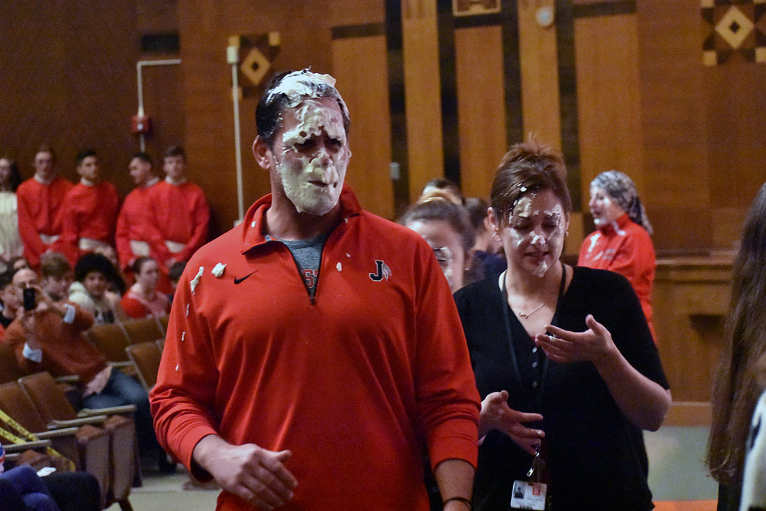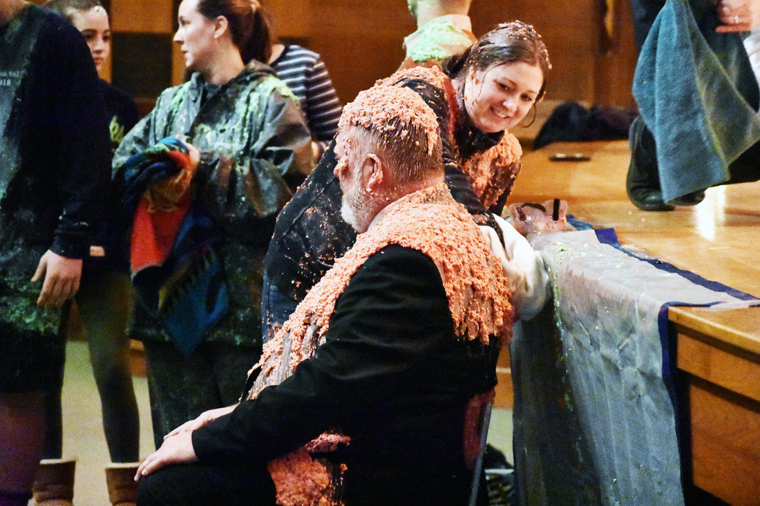 Part of the Penny Wars tradition includes students and faculty get pied by a desert or slimed by a orange and green substance. Superintendent Bret Apthorpe was slimed this year.