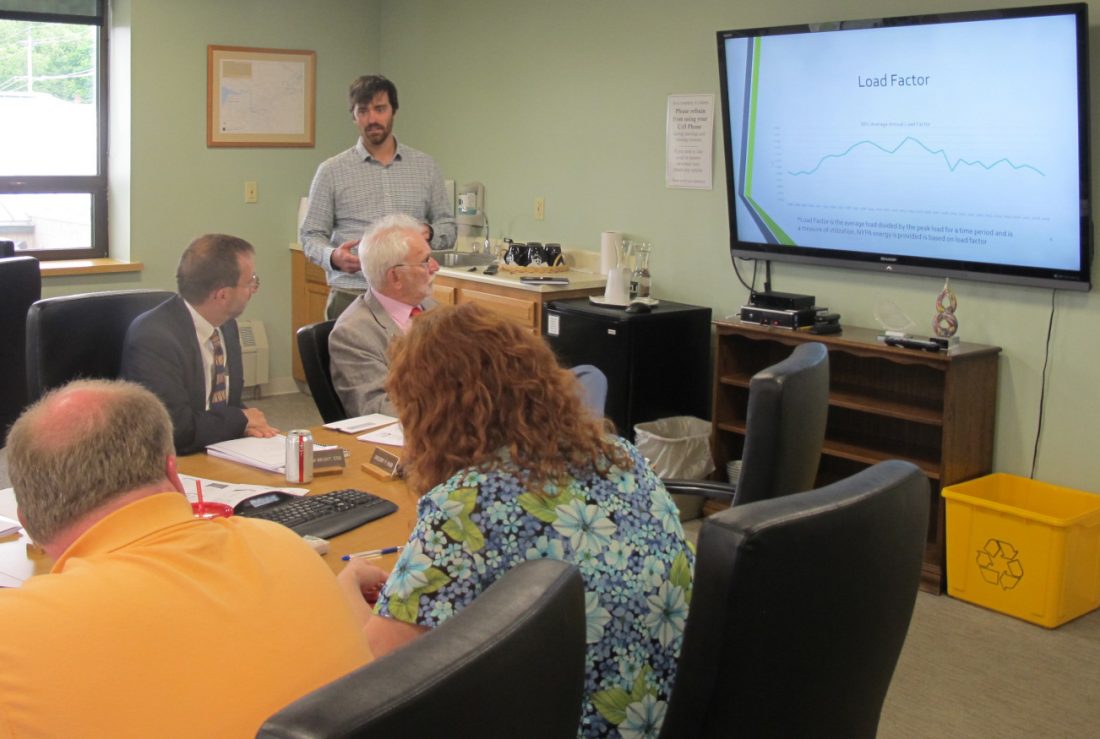 Standing, Kris Sellstrom, Jamestown Board of Public Utilities electrical engineer, gives a risk management presentation on the electricity market during a regular meeting of the BPU board Monday. P-J photo by Dennis Phillips