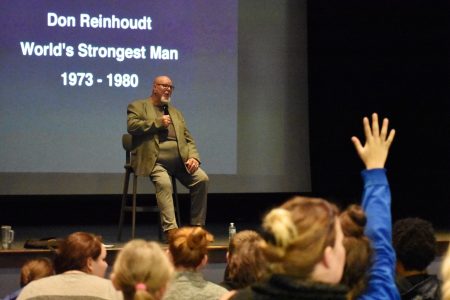 Inside Cassadaga Valley Central School on Wednesday, Reinhoudt told stories to students, who he noted were young enough to be his grandchildren, about how he became the world’s strongest man while competing in the 1970s. A video was also screened that displayed his numerous feats of strength as he competed for the title he is most known for.