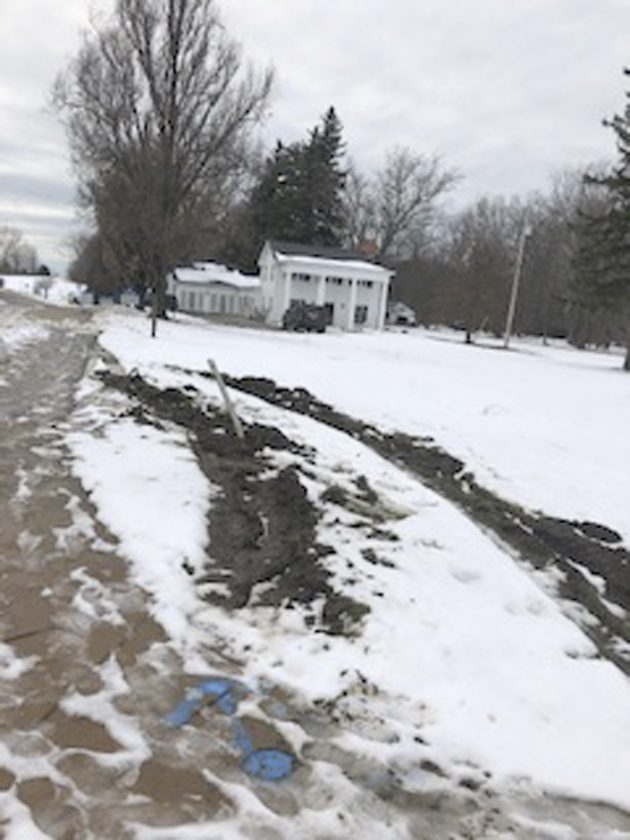 Tire marks are pictured after a student at the State University of New York at Fredonia reportedly stole an ambulance early Wednesday. The vehicle sustained front-end and undercarriage damage. Submitted photo