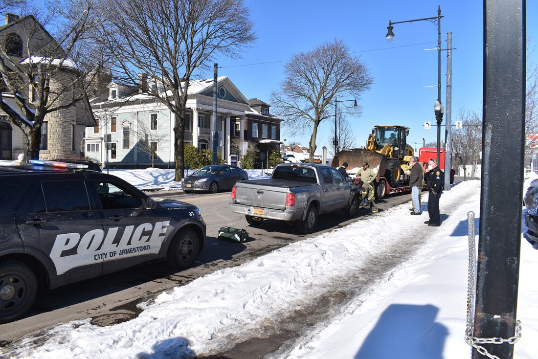 Traffic was slowed on North Main Street, between East Fifth and East Sixth streets, in the city of Jamestown on Thursday after a pickup truck struck the rear of a flatbed semi tractor-trailer that was hauling excavation equipment. The collision occurred before noon. The pickup truck appears to have sustained significant front-end damage. Members of the Jamestown police and fire departments responded to North Main. There were no reports of injuries.