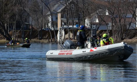 Crews from Chautauqua County Emergency Services and City of Warren Fire Department search the Allegheny River near the western trestle in the City of Warren on Saturday. Also participating in the search for missing persons John C. Nelson and Nicole L. Font were City of Warren Police, Glade Volunteer Fire Department, New York State Police K-9 unit Zone 4 — Olean, Jamestown Police Department, and Rosie Marketing LLC. Photos by Brian Ferry