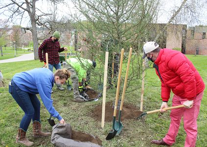 Jamestown Community College students and employees joined community members in celebrating Arbor Day on Friday by planting five trees on its Jamestown campus. Dr. Kirk Young, vice president of student affairs, delivered the Arbor Day proclamation and Chautauqua County Executive PJ Wendel made remarks congratulating the college on its Tree Campus Higher Education recognition from the Arbor Day Foundation. Assisting the city of Jamestown arborist and park manager, Dan Stone, in the planting of the trees were student Urban Forestry interns Bryanna Davis, Caleb Roller, and Jacob Bullich, and David Talkington, a student worker in the collegeás maintenance department. American larch, Kentucky coffee, and sassafras, and mulberry trees were planted across the campus. JCC became the first community college in New York to receive the designation 12 years ago for its commitment to effective urban forest management.