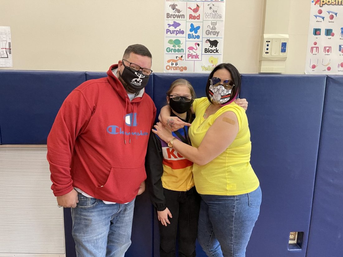 Geovany Santigio and Carmen Nieves are pictured Thursday after receiving their COVID-19 vaccines at Love Elementary School in Jamestown with the support of their niece, Jamestown High School junior Yunsia Santiago. Photos by Cathy Panebianco