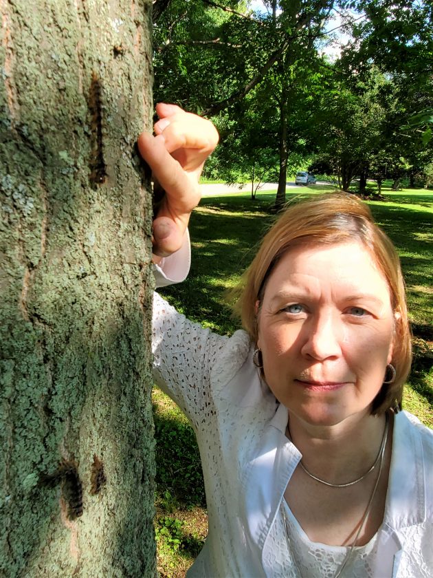 Cornplanter District Forester Cecile Stelter talks about the pathogens helping keep the gypsy moth population in check and why dead caterpillars are hanging on trees. The dead caterpillar pictured was killed by a fungus. Caterpillars lower on the tree, that are hanging in an upside-down V shape, were killed by a virus. Photo by Brian Ferry