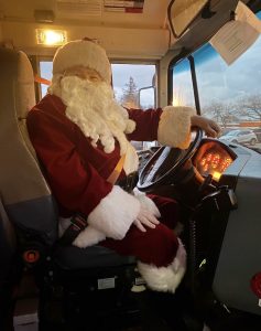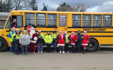 Pictured is Santa and all his helpers, who were out safely transporting children home in Dunkirk and Fredonia, on First Student buses this afternoon for the long-awaited winter break.