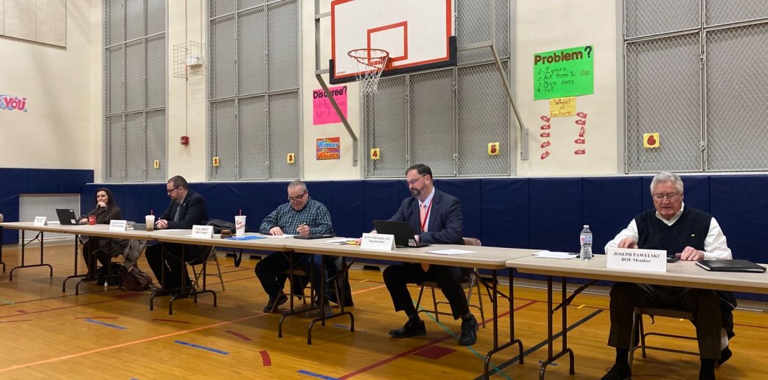 Members of the Jamestown Public Schools Board are pictured at Tuesday night’s meeting. The district is looking to purchase two and a half parcels of land. P-J photo by Katrina Fuller