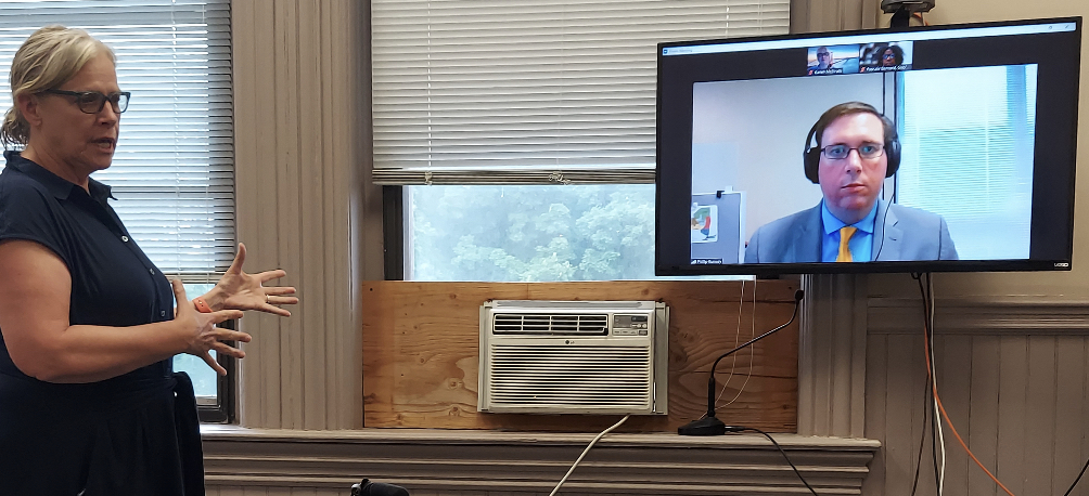 Susan Parker, Chautauqua County legislator and member of Fredonia’s Cannabis Advisory Committee, introduces Phillip Rumsey of the New York State Office of Cannabis Management during a meeting of the committee Tuesday. PJ Photo by M.J. Stafford