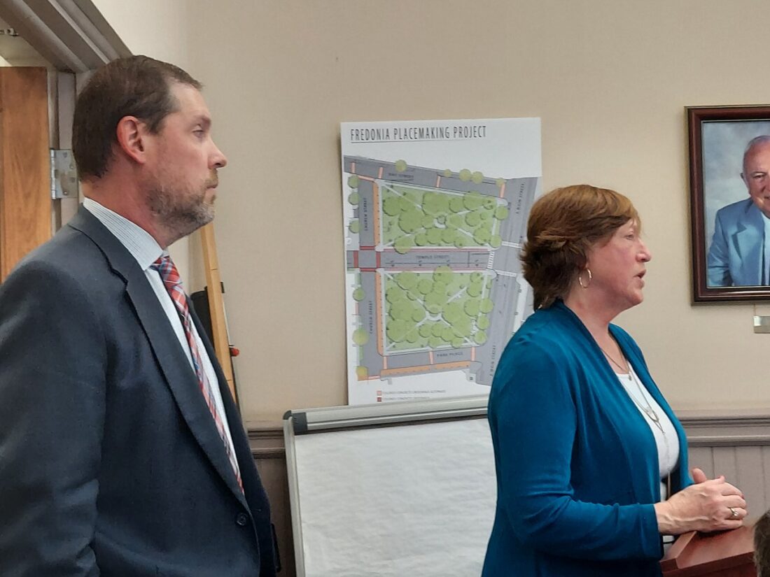Mary LaRowe, right, Brooks Memorial Hospital’s CEO, speaks about the planned new facility in Fredonia at a Tuesday meeting of the village’s Planning Board. Looking on is Marc Romanowski, Brooks’ top attorney for the construction efforts. Photo by M.J. Stafford