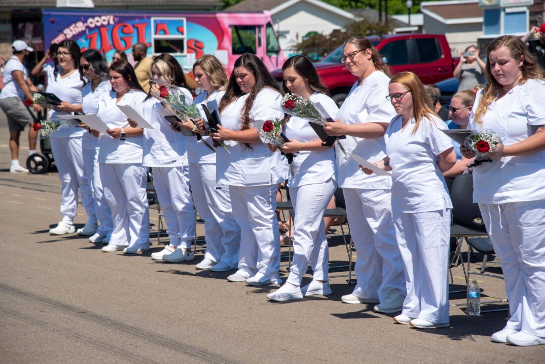 Practical nursing graduates are pictured reciting the Nurse’s Pledge to close the graduation ceremony. Submitted photos