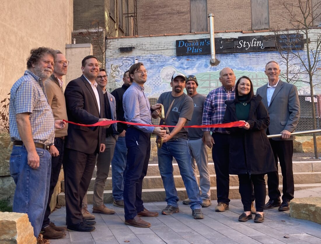 The Jamestown Renaissance Corporation celebrated a ribbon cutting ceremony Wednesday for the newly constructed space at Potters Terrace. Pictured, from left, are Brent Sheldon, Joe Rollman, Eddie Sundquist, Luke Fodor, Shad Griffen, Frank Besse, Josh Graham, Jason Sivak, Jeff Lehman, Crystal Surdyk and Greg Edwards. Submitted photo