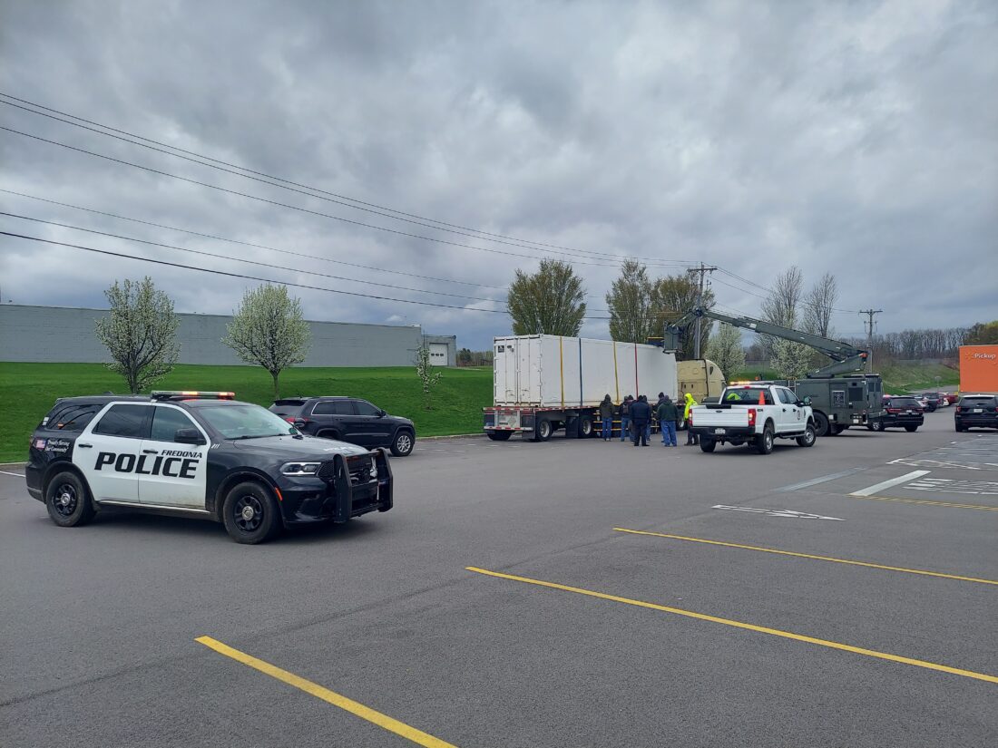 A city of Dunkirk lift truck was seen Monday afternoon parked next to the light-colored semi, which appeared to have damage to its trailer. A man in the truck’s boom bucket was observed looking into the trailer, while another man was photographed with what appeared to be a black plastic container.