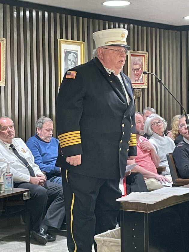 Larry Barter with the Fredonia Fire Department and the chairman of Chautauqua County’s Emergency Medical Services Council expresses support of the proposal to give a 10% property tax reduction to volunteer firefighters and ambulance workers in their county taxes. P-J photo by Gregory Bacon