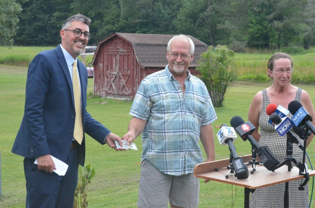 Warren County Crime Stoppers President Gary Barnes presented the Ecklunds, whose 911 call resulted in the capture of jail escapee Michael Burham, with a $2,000 cash reward at their home on Tuesday.