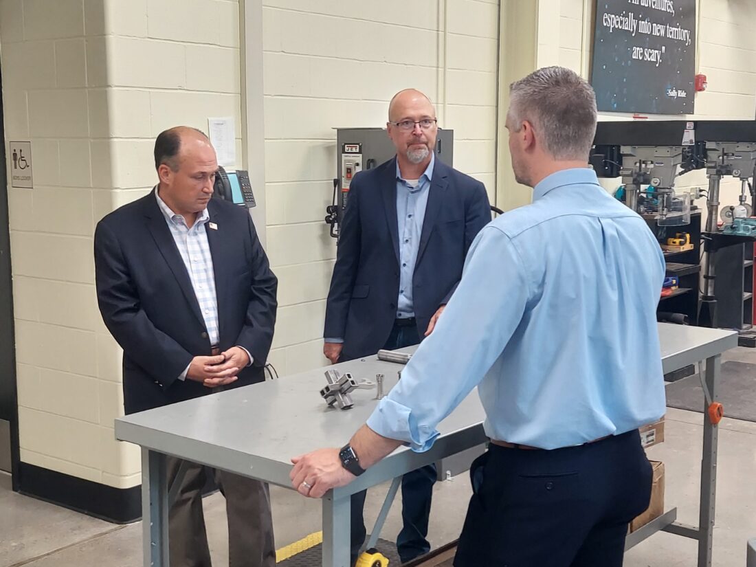 U.S. Rep. Nick Langworthy (left) tours the P-TECH school in Dunkirk Thursday afternoon. He is joined by Todd Tranum, Executive Director of the Manufacturers Association of the Southern Tier and President of Dream It Do It WNY, and Bill Smock, principal of P-TECH (right). Photo by M.J. Stafford
