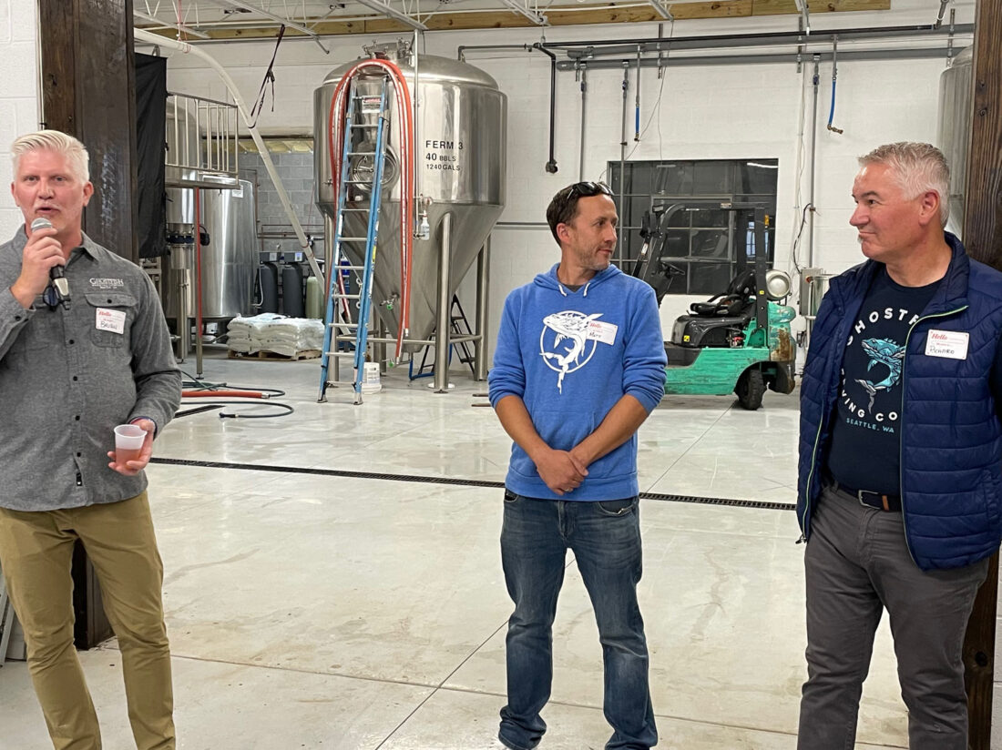 From left Ghostfish Brewery Company co-owners Brian Thiel, Matt Swank, and Richard Smith discuss opening an northeast production center inside the Grape Discovery Center in Westfield. P-J photo by Michael Zabrodsky