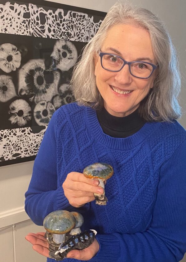Bale works primarily in clay and paper sculpture. Her ceramic ‘Mushroom Menagerie’ features more than 100 realistically detailed fungi.
