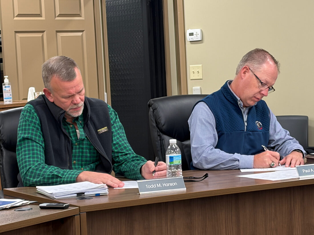 From left, Busti Councilman Todd Hanson, and Councilman Paul Gustafson look over town documents Monday.