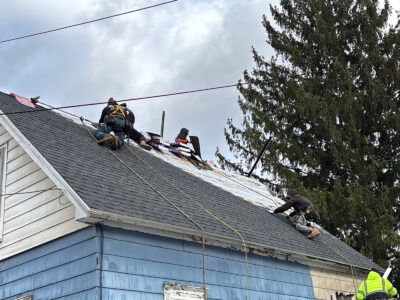 CRS workers install a new roof at Thomas Rose’s Bradford, Pa. Home.