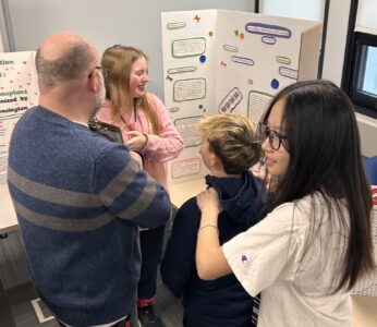 Students discuss their project with a teacher at the Liftoff of Epipens display.