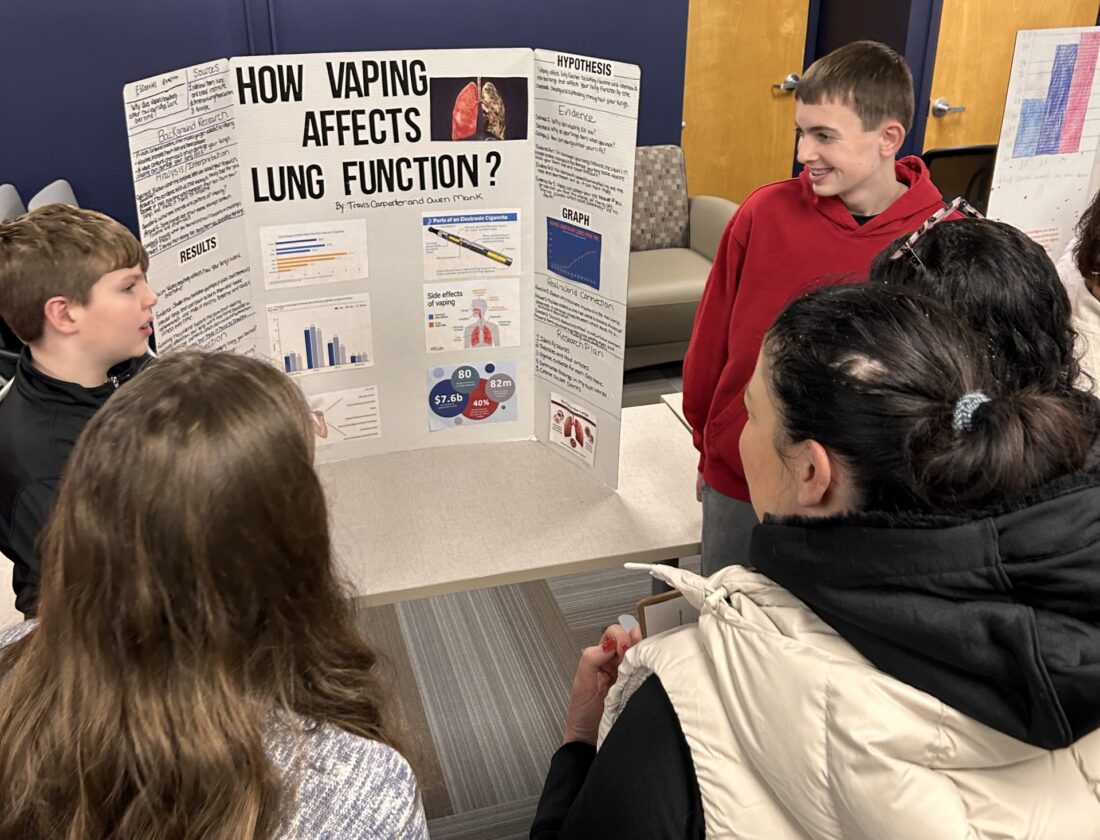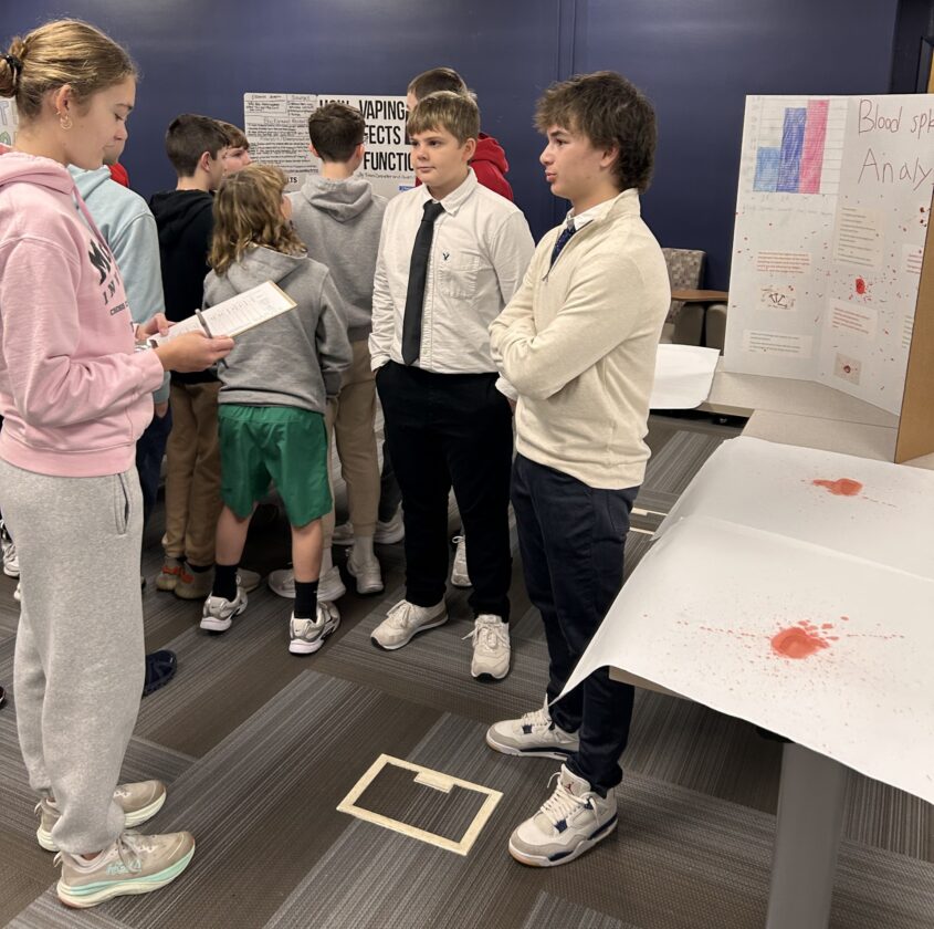 “I want to commend our eighth grade Regents Biology students for the tremendous effort they put into their science fair research and for the creativity they showed in presenting their work to staff, students, and families,” said Middle School Principal Greg Lauer. “I was especially impressed by the range and depth of topics, including blood spatter analysis, the effects of vaping on lung function, strawberry DNA, and bacteria blockers. A special thank-you goes to their teacher, Alexis Johnson, whose dedication and hard work made this experience so meaningful for our students.”